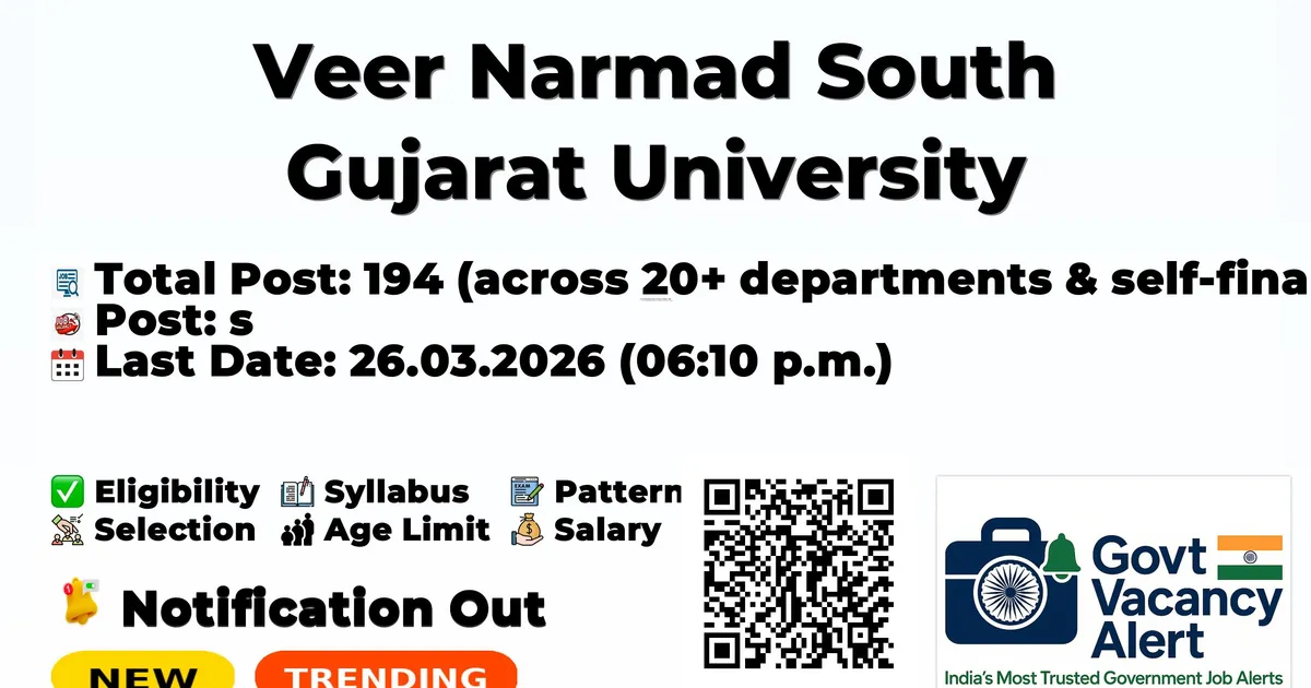 Veer Narmad South Gujarat University (VNSGU) has released an official notification for the recruitment of 194 Assistant Professor, Tutor and More Posts. Interested and eligible candidates can apply Online through the official VNSGU website. The last date to submit the application form is 26-03-2026. In this article, you’ll find the VNSGU Assistant Professor, Tutor and More Posts recruitment details, including eligibility criteria, age limit, salary structure, selection process, application steps, and direct links to the official notification and Online application form.