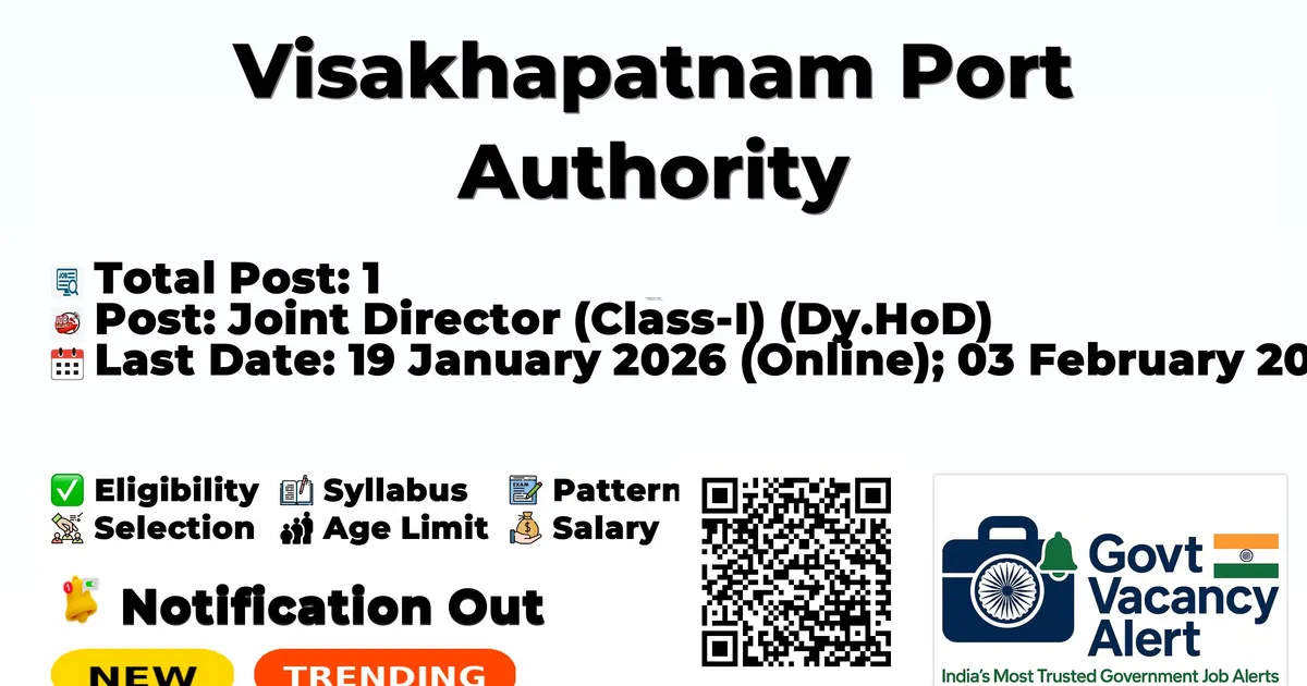 Company Name Visakhapatnam Port Authority Post Name Joint Director (Class-I) (Dy.HoD) No of Posts 1 Salary Rs. 80,000-2,20,000 (Scale of Pay) Qualification Degree in Economics, Statistics, Mathematics, or Computer Engineering Start Date for Apply 17 December 2025 (Online Application Portal opens) Last Date for Apply 19 January 2026 (Online); 03 February 2026 (Hard Copy submission) Official Website vpt.shipping.gov.in