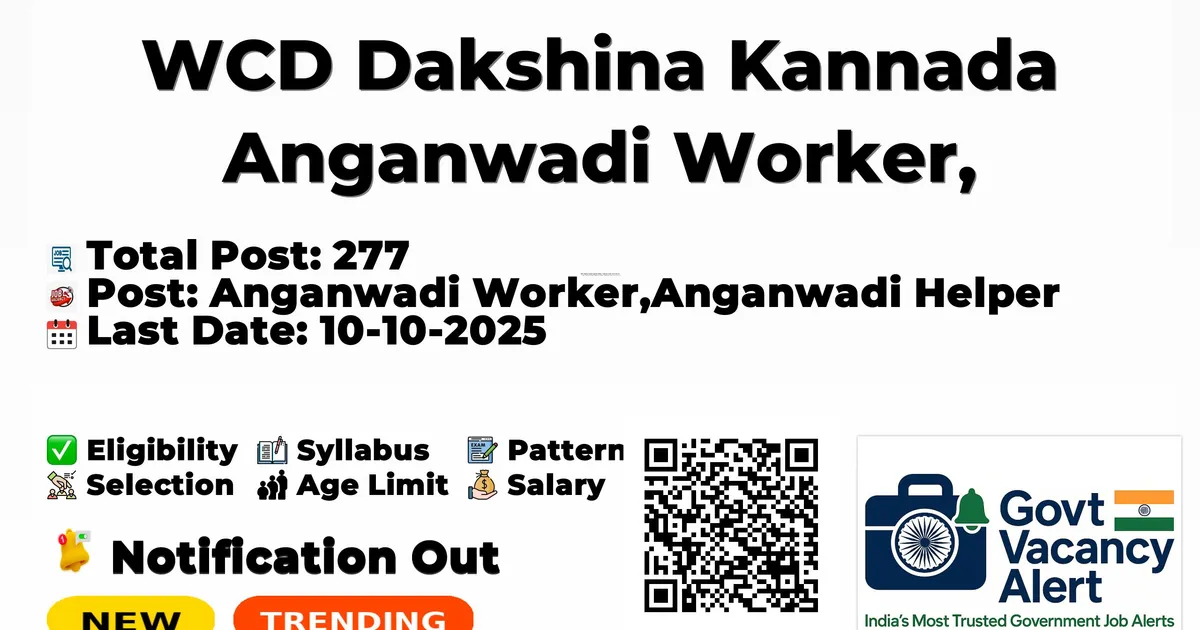 The Women and Child Development Department Dakshina Kannada (WCD Dakshina Kannada) Recruitment 2025 for 277 posts of Anganwadi Worker, Anganwadi Helper. Candidates with 12TH, 10TH Can Apply Online. The online application opens on 02-09-2025, and closes on 10-10-2025. The candidate shall apply online through WCD Dakshina Kannada website, karnemakaone.kar.nic.in.