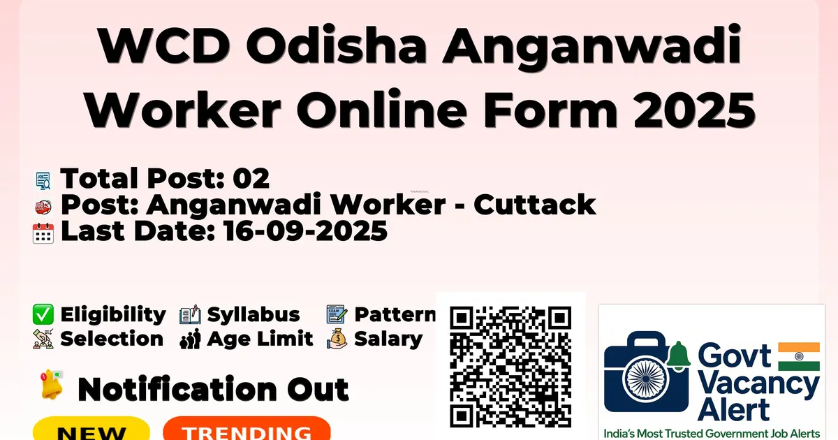 The Women and Child Development Odisha (WCD Odisha) Recruitment 2025 for 02 posts of Anganwadi Worker. Candidates with 12TH Can Apply Online. The online application opens on 02-09-2025, and closes on 16-09-2025. The candidate shall apply online through WCD Odisha website, awc.odisha.gov.in.