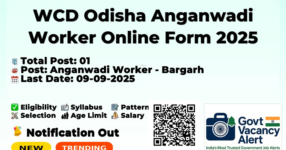The Women and Child Development Odisha (WCD Odisha) Recruitment 2025 for 01 posts of Anganwadi Worker. Candidates with 12TH Can Apply Online. The online application opens on 26-08-2025, and closes on 09-09-2025. The candidate shall apply online through WCD Odisha website, awc.odisha.gov.in.