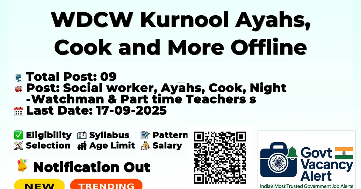 The Women and Child Welfare and Empowerment Office Kurnool (WDCW Kurnool) Recruitment 2025 for 09 posts of Ayahs, Cook and More. Candidates with B.Ed, B.Sc, 10TH, BPEd, BSW, PG Diploma, 7th Can Apply Offline. The Offline application opens on 09-09-2025, and closes on 17-09-2025. The candidate shall apply Offline through WDCW Kurnool website, kurnool.ap.gov.in.