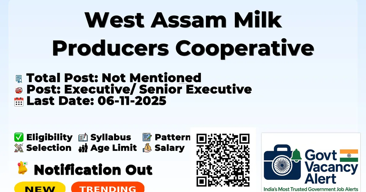 Company Name West Assam Milk Producers Cooperative Union (WAMUL) Post Name Executive/ Senior Executive No of Posts Not Mentioned Pay Matrix Rs. 850000-987000 PA Qualification MBA/PGDM Age Limit Not above 35 years Start Date for Apply Online 18-10-2025 Last Date for Apply Online 06-11-2025 Official Website purabi.coop