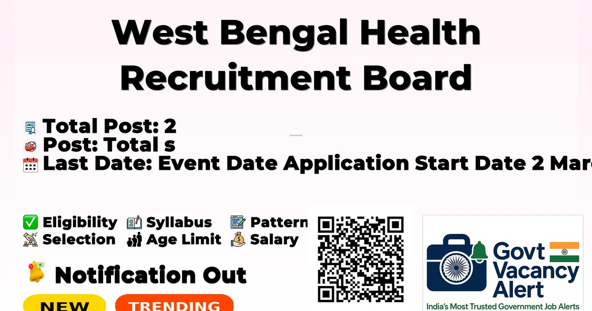 West Bengal Health Recruitment Board (WBHRB) has released an official notification for the recruitment of 2 Regional Health Transport Officer Posts. Interested and eligible candidates can apply Online through the official WBHRB website. The last date to submit the application form is 23-03-2026. In this article, you'll find the Regional Health Transport Officer recruitment details, including eligibility criteria, age limit, salary structure, selection process, application steps, and direct links to the official notification and application form. Advertisement Company Name West Bengal Health Recruitment Board (WBHRB) Post Name Regional Health Transport Officer No of Posts 2 Advt No R/Regional Health Transport Officer /3/2026 Qualification Details of eligibility will be available on the website. Last Date 23-03-2026 Apply Mode Online Job Type Full Time Trending Govt Jobs RRB 22000 Group D Online form 2026 IAF Agniveer New Recruitment 2026 DSSSB 911 AE, JE & More Online Form 2026 MCL 677 Various Vacancies Online Form 2026 MMRDA 235 AE, JE and More Posts Online Form 2026 Candidates who are interested in applying for the WBHRB Recruitment 2026 should first download and carefully read the official notification PDF. The notification contains complete details about vacancy distribution, eligibility criteria, age limit, stipend/salary, selection process, important dates, and application instructions. Reading the official document is important to ensure that you meet all requirements before submitting the application form. Download WBHRB Regional Health Transport Officer Job 2026 Notification PDF Post Name Total Posts Regional Health Transport Officer 2 Total 2 Regional Health Transport Officer: Details of eligibility will be available on the website. Details of age limit will be available on the website. Event Date Application Start Date 2 March 2026 Last Date to Apply 23 March 2026 Please refer to the official notification for selection process details. Candidates who meet the eligibility criteria can apply online for the WBHRB Regional Health Transport Officer Recruitment 2026. Applications must be submitted online on or before 23-03-2026. To apply directly, use the Apply Online link provided in the Important Links section. Alternatively, candidates may visit the official website of WBHRB to complete the application. Fill out the application form carefully with correct personal, educational, and contact details. Upload required documents such as photograph, signature, and certificates in the prescribed format. Pay the application fee online, if applicable. Review all details carefully before submitting the form. Take a printout or save a copy of the submitted application for future reference. Link Description Link Official Notification PDF Click here Apply Online Click here Official Website Click here