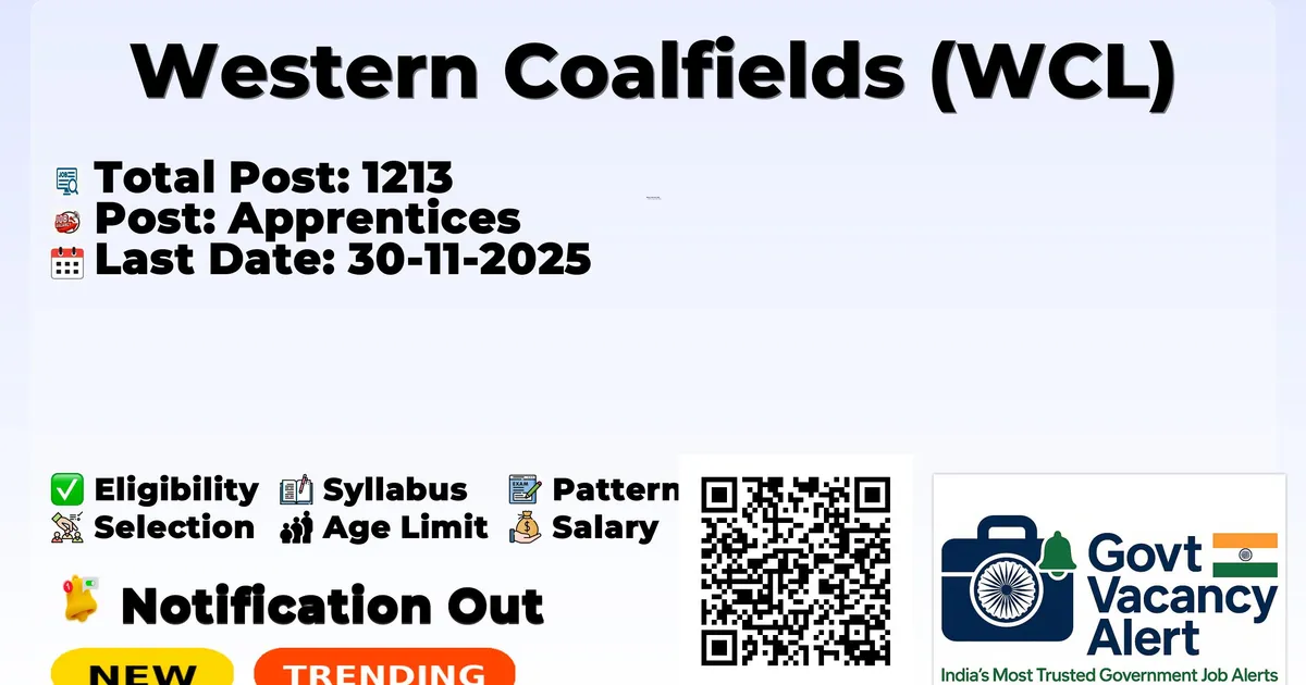 Company Name Western Coalfields (WCL) Post Name Apprentices No of Posts 1213 Advt No WCL/HRD/Apprentice/Notification/2025-26/51 Salary 8,200 to 12,300 Qualification B.Tech/B.E, Diploma, ITI, 12TH, 10TH Age Limit 18 to 26 years Start Date for Apply Online 17-11-2025 Last Date for Apply Online 30-11-2025 Official Website westerncoal.in