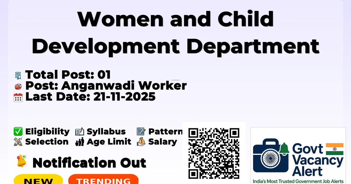 Women and Child Development Department (WCD Odisha) has released an official notification for the recruitment of 01 Anganwadi Worker Posts. Interested and eligible candidates can apply Online through the official WCD Odisha website. The last date to submit the application form is 21-11-2025. In this article, you’ll find the WCD Odisha Anganwadi Worker Posts recruitment details, including eligibility criteria, age limit, salary structure, selection process, application steps, and direct links to the official notification and Online application form. Join Arattai Channel Trending Govt Jobs SAIL 124 Management Trainee (Tech) Online Form 2025 KVS and NVS Online Form 2025 RRB NTPC 5,810 Online Form 2025 Bank of Baroda 2700 Apprentices Online Form 2025 Intelligence Bureau (IB) ACIO II Tech Online Form 2025 Advertisement Company Name Women and Child Development Department (WCD Odisha) Post Name Anganwadi Worker No of Posts 01 Qualification 12TH Age Limit 18 to 35 years Start Date for Apply Online 07-11-2025 Last Date for Apply Online 21-11-2025 Official Website awc.odisha.gov.in Candidates Should Posses 12TH Pass Minimum Age Limit: 18 Years Maximum Age limit: 35 Years Age relaxation is applicable as per rules. Starting Date for Apply Online: 07-11-2025 Last Date for Apply Online: 21-11-2025 Apply Online: Click here Official Notification PDF: Click here Official Website: Click here Join Arattai Channel: Click Here Join Telegram Channel: Click Here Join WhatsApp Channel: Click Here Sarkari Result: Click Here Download Mobile App: Click Here Jobs In Odisha Anugul Balangir Baleshwar Bargarh Baudh Bhadrak Bhubaneshwar Cuttack Debagarh Dhenkanal Gajapati Ganjam Jagatsinghapur Jajapur Jharsuguda Kalahandi Kandhamal Kendrapara Kendujhar Khordha Koraput Malkangiri Mayurbhanj Nabarangapur Nayagarh Nuapada Paradeep Puri Rayagada Rourkela Sambalpur Subarnapur Sundargarh Also Read SEBI Recruitment 2025 - Officer Grade A (Assistant Manager) Vacancies - Rs 62500 to 126100 Salary - Apply Now Intelligence Bureau ACIO II Tech Recruitment 2025 - 200+ Vacancies Across India - 44900-142400 Salary - Apply Now RRB Recruitment 2025 - 2500+ JE (Junior Engineer) Vacancies - 35400 Monthly Salary - Apply Now Jobs By Education 10TH Jobs› 8TH Jobs› 12TH Jobs› Diploma Jobs› ITI Jobs› B.Tech/B.E Jobs› B.com Jobs› Any Graduate Jobs› Any Post Graduate Jobs› Bank of Baroda 2700 Apprentices Online Form 2025 RRB 2569 JE (Junior Engineer) Online Form 2025 RRB NTPC 12TH Level Online Form 2025 3058 Post BRO 542 MSW, Vehicle Mechanic Offline Form 2025 Territorial Army 1529 Soldier Offline Form 2025 ONGC 2623 Apprentices Online Form 2025 BSSC 23175 Inter Level Online Form 2025 ISRO SDSC SHAR Various Vacancy Online Form 2025 RRB NTPC 8850 Online Form 202526 1. What is the starting date to apply online for WCD Odisha Anganwadi Worker 2025? Ans: Starting Date to apply online is 07-11-2025. 2. What is the last online apply date for WCD Odisha Anganwadi Worker 2025? Ans: Last online apply date is 21-11-2025. 3. What is the Eligibility to apply for WCD Odisha Anganwadi Worker 2025? Ans: 12TH Pass 4. What is the Maximum Age Limit to apply for WCD Odisha Anganwadi Worker 2025? Ans: 35 Years 5. How many vacancies are being recruited by WCD Odisha Anganwadi Worker 2025? Ans: Total 01 Vacancies.
