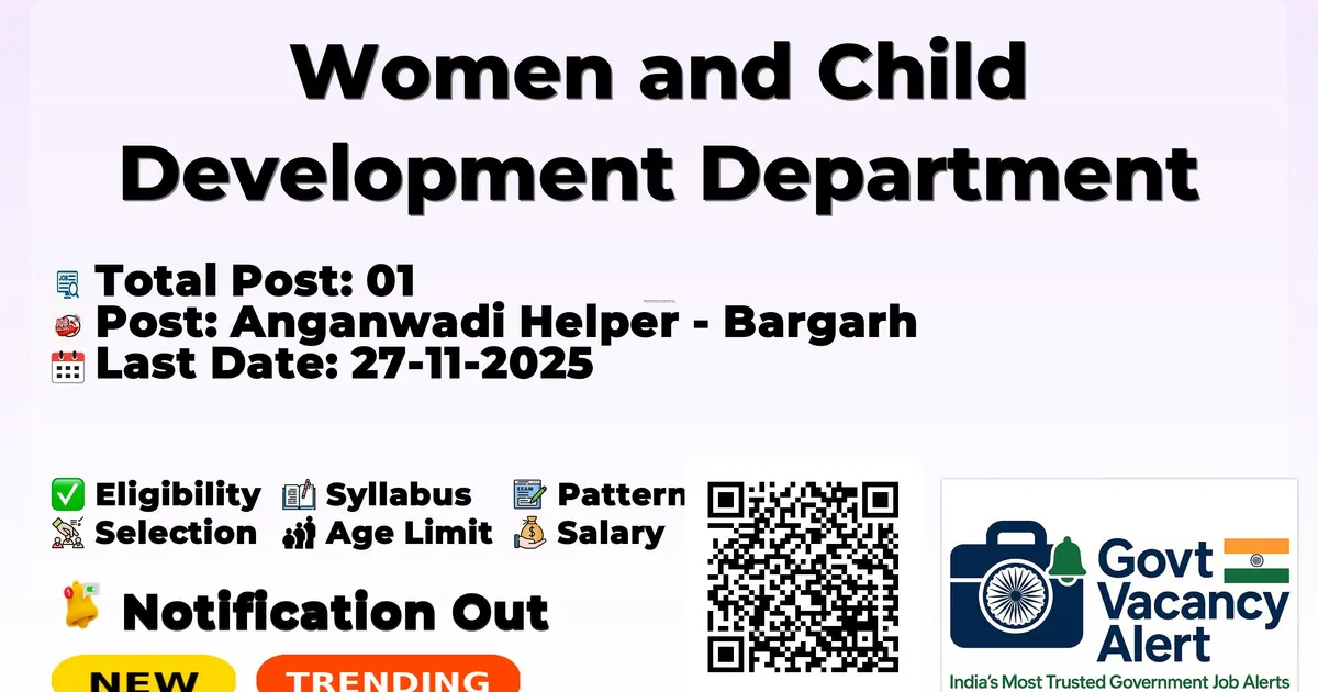 Company Name Women and Child Development Department (WCD Odisha) Post Name Anganwadi Helper - Bargarh No of Posts 01 Qualification 12TH Pass Age Limit 18 to 35 years Start Date for Apply Online 13-11-2025 Last Date for Apply Online 27-11-2025 Official Website awc.odisha.gov.in