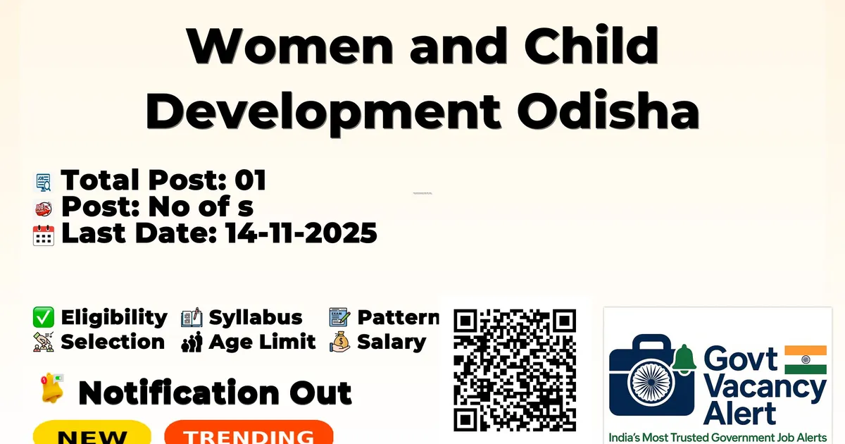 Company Name Women and Child Development Odisha (WCD Odisha) Post Name Anganwadi Worker No of Posts 01 Qualification 12TH Age Limit 18 to 35 years Start Date for Apply Online 31-10-2025 Last Date for Apply Online 14-11-2025 Official Website awc.odisha.gov.in