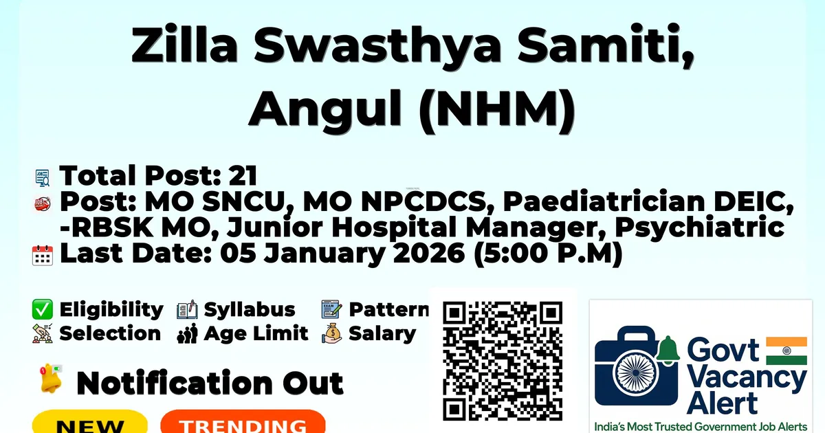 Company Name Zilla Swasthya Samiti, Angul (NHM) Post Name MO SNCU, MO NPCDCS, Paediatrician DEIC, RBSK MO, Junior Hospital Manager, Psychiatric Nurse, VBDTS, Social Worker DEIC, Data Assistant Cum Accountant, Dental Technician DEIC, RBSK Pharmacist, RBSK Staff Nurse/ANM No of Posts 21 Start Date for Apply 16 December 2025 Last Date for Apply 05 January 2026 (5:00 P.M) Official Website angul.odisha.gov.in