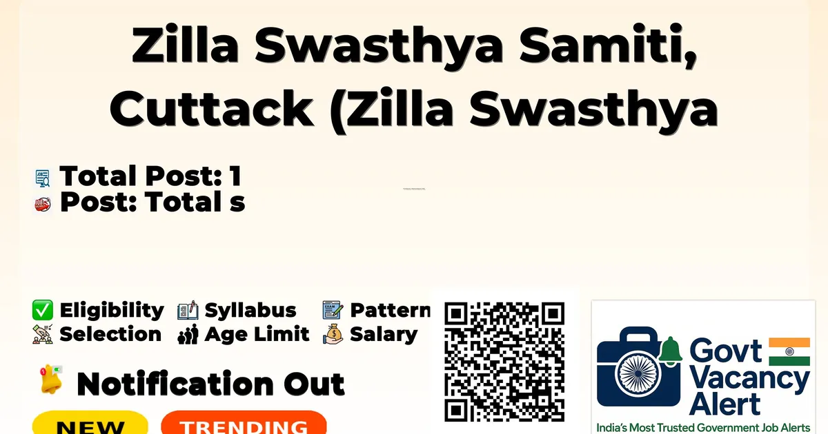 Company Name Zilla Swasthya Samiti, Cuttack (Zilla Swasthya Samiti Cuttack) Post Name Medical Officer No of Posts 1 Advt No 368/DPMU/NHM/2026 Qualification MBBS Degree, Permanent Registration Number from Odisha Council of Medical Registration, Bhubaneswar, Completed Compulsory Internship Age Limit Max: 70 years Walk-in Date 26 February 2026 Apply Mode Walk-in Job Type Contractual